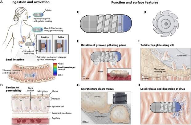 По прибытии в кишечник таблетка вкручивается в его тонкие стенки для более точечного ввода лекарства, благодаря чему можно избежать операций. После ввинчивания оболочка разрушается и вводится препарат.